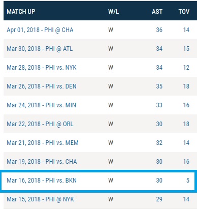 So they’re 10-0 dating back to March 15th with 14.2 turnovers per game. Seems like a lot, but that number actually puts you right in the middle of the league, 16th place between Miami and Oklahoma City. The Sixers are still the worst turnover team in the NBA, but it’s not affecting the win/loss column at all, and they’ve steadily driven that number down to something manageable over the past two months.