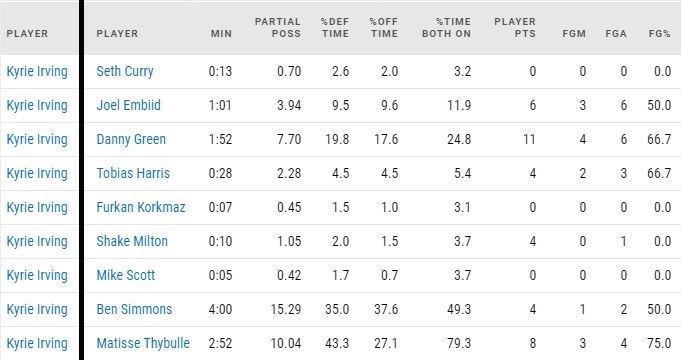 We didn’t learn a ton about that on Wednesday, but the Sixers opened with Ben Simmons on Kyrie Irving, who also got some time going up against Matisse Thybulle and Danny Green. Here’s the matchup data we were given at NBA Stats: