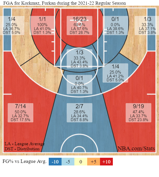 Furkan scored a season-high 25 points in Saturday night’s road win, boosting the Sixers to 8-2 on the season. He’s doing a lot of the same things you’re seeing from guys like Georges Niang and Danny Green, which is adhering to the analytics in firing three pointers or getting to the rim. There is very little midrange stuff in his seasonal shot plot: