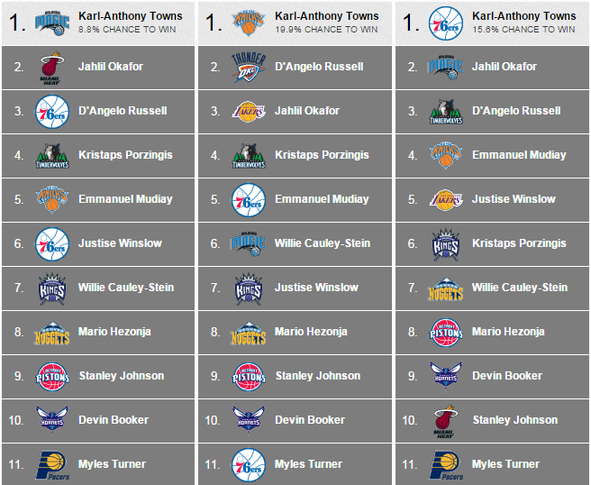 Tonight, for all of Sam Hinkie’s maneuvering and planning, the bouncing of some tiny, white balls will play a large part in the Sixers’ future. At around 8:30 p.m., this year’s draft order will be announced. With the third-worst record, the Sixers have a 15.6% shot at landing the top pick. But of bigger concern to many Sixers fans is getting the Heat’s pick at 11 and the Lakers’ pick at 6. The chances of landing either is slim, but this is what happened on my first three lottery simulations last night. I swear.