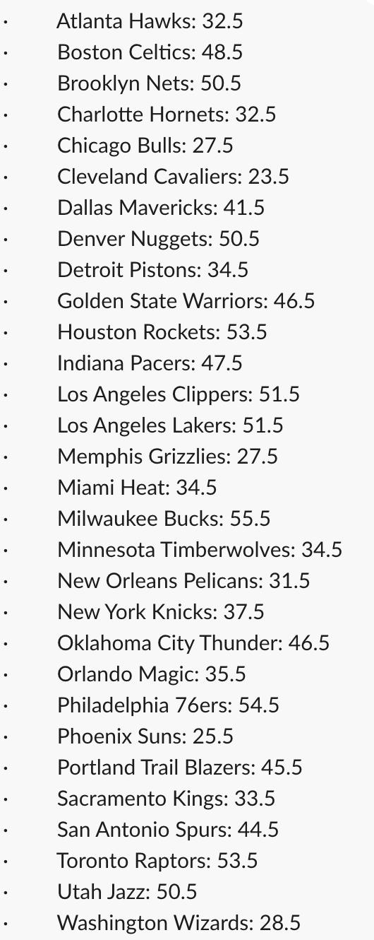 Your team, your town, your 76ers are listed at 54.5, which feels… a little high? It feels a little high to me, considering they won 52 games in 2017 and 51 games last year and we have no clue if Jimmy Butler and Tobias Harris are coming back. I think a healthy Joel Embiid fairly easily carries you over the 54 win total, but Joel finished last season with 64 games, just one more than the 63 he appeared in the year prior.