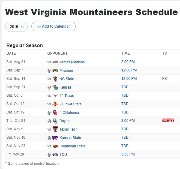 West Virginia schedule