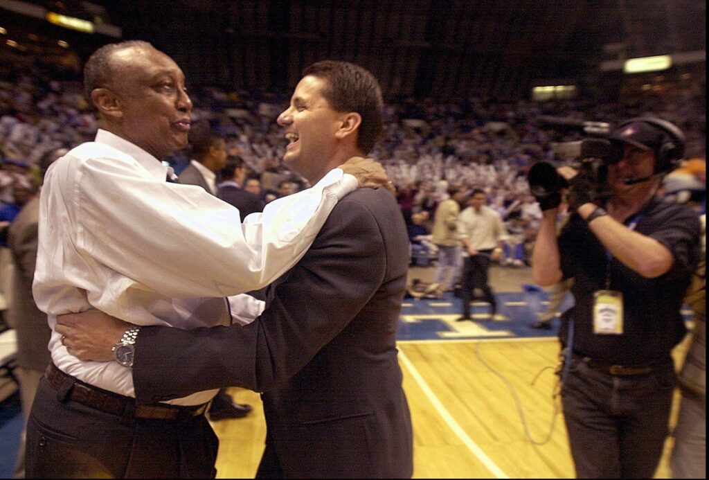 November 17, 2000 - Temple men's basketball head coach John Chaney (left) embraces University of Memphis head coach John Calipari before their teams' game at the Pyramid. John Calipari Tigers