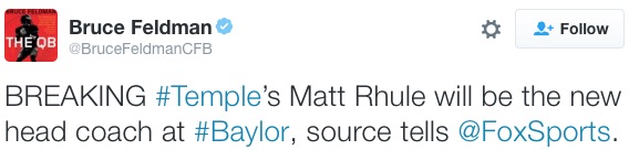 Well, Temple football was fun while it lasted. So much for Matt Rhule coaching the Eagles. So much for that statue. Rhule leaves to coach in the Big 12 for perennially top 25 team.