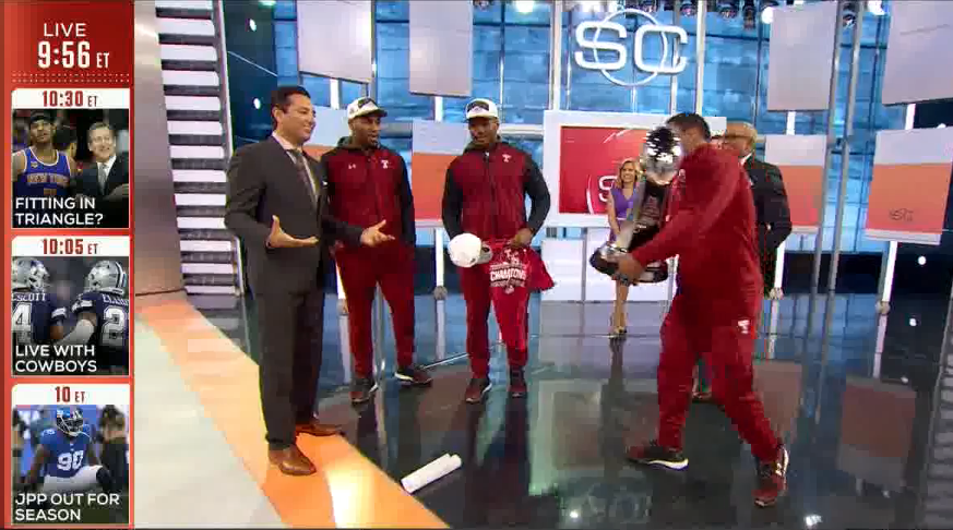 Temple alum and superfan Kevin Negandhi hosted SportsCenter this morning and got the surprise of his life. No, he didn’t sleep all day yesterday and get the Matt Rhule news live on air, he got to hold Temple’s AAC Championship trophy.