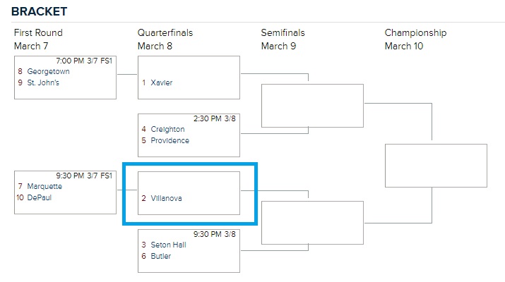They’re the #2 seed in the conference tournament, so tomorrow they’ll play the winner of tonight’s DePaul/Marquette game. From there they’d play the Seton Hall/Butler winner. Nova went 7-1 against those four teams with a pair of close road wins at Hall and Marquette, so I obviously like their chances to meet Xavier in the tournament final.