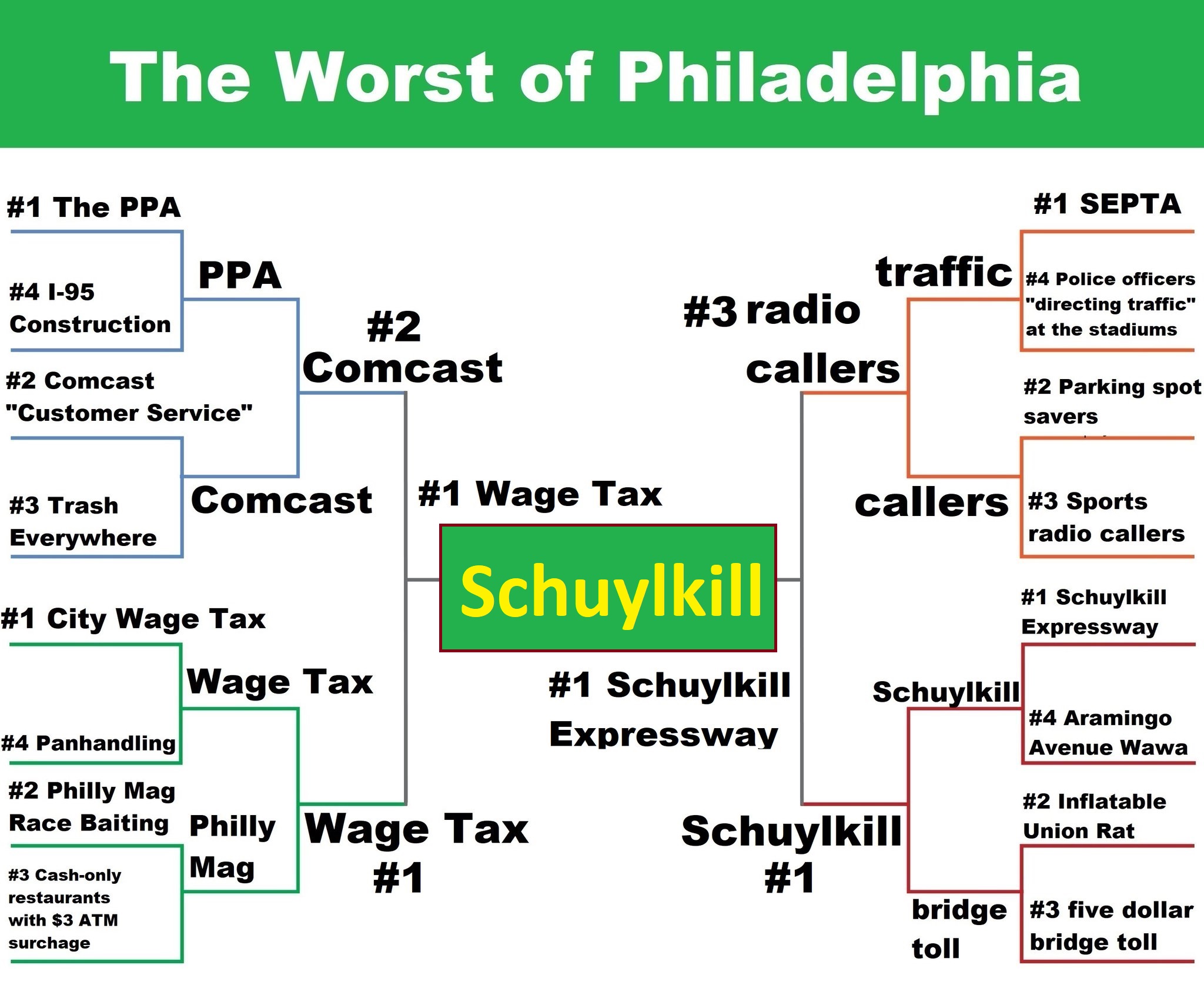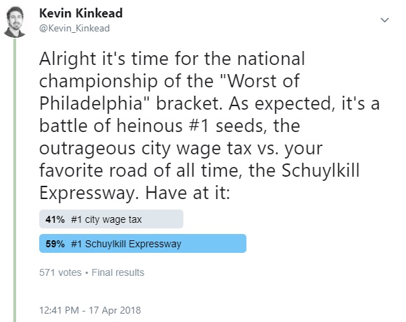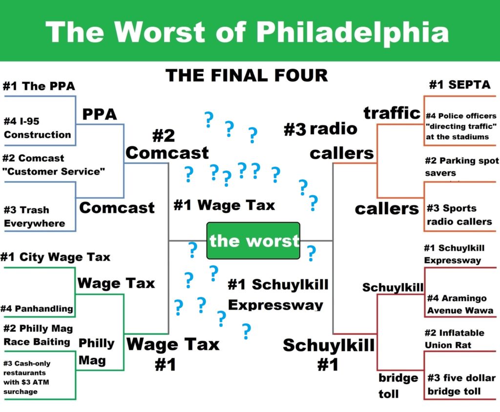 After three grueling weeks, we arrived at the national championship of our “Worst of Philadelphia” bracket, a battle for the ages between the insidious and diabolical city wage tax and the abhorrent and detestable Schuylkill Expressway. God help anybody who has to deal with both of those things in the same pay period.