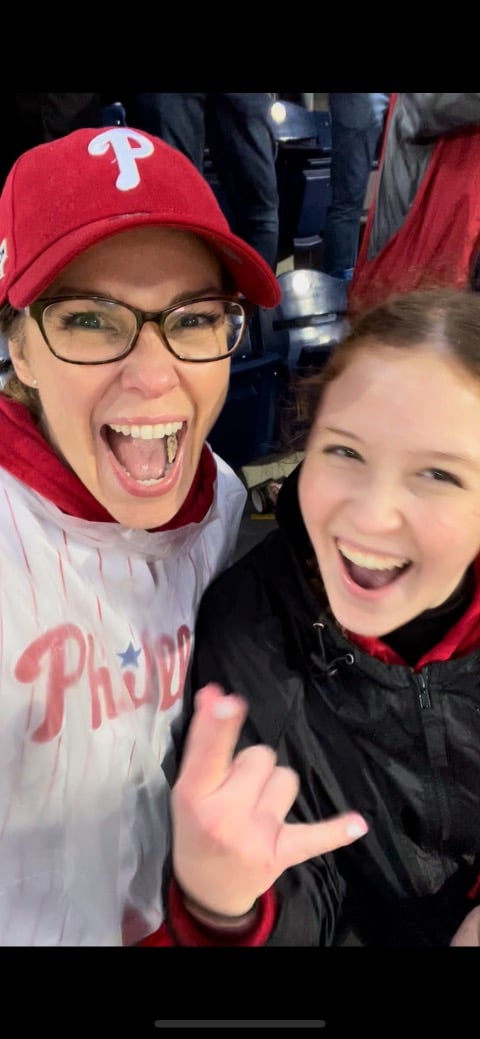 By day, Kim is the director of marketing and communications at Merion Mercy Academy. By night, she is a playwright based in Media, PA. And while that’s cool and all, what’s even cooler is her husband, Rob MacPherson, works for the Phillies as the Director of Partnerships and Corporate Marketing. So, Kim had no choice but to love the Phillies. And it’s a love affair she wouldn’t trade in for the world.