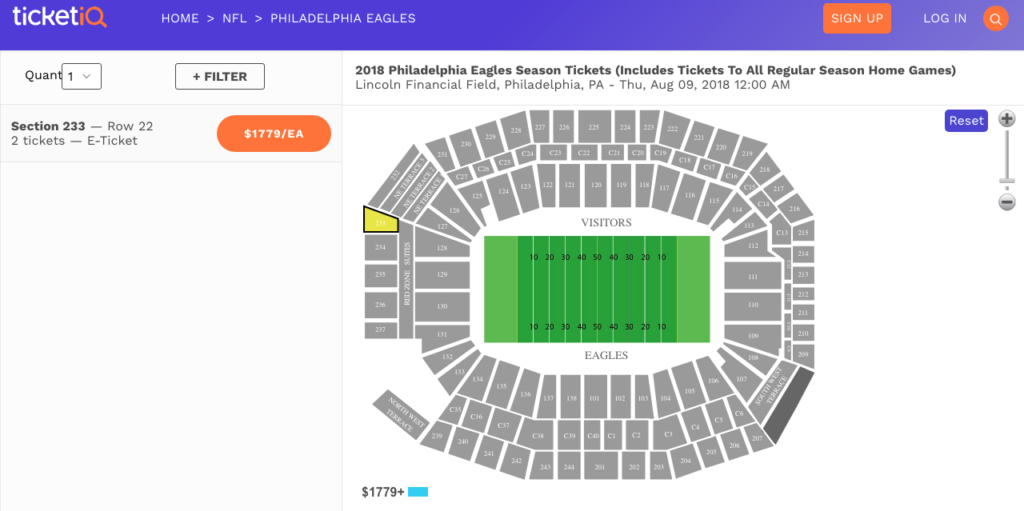 You can get two seats to all eight Eagles home games in Section 233 Row 22 for $1,779 per seat.