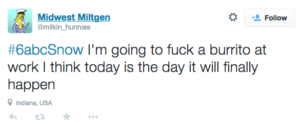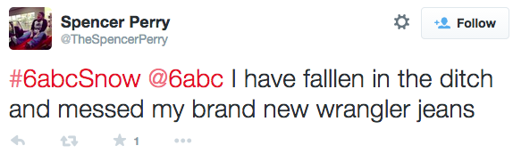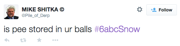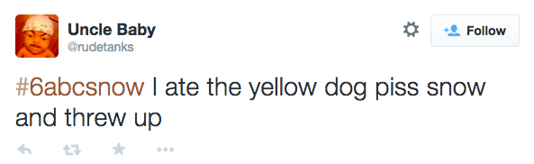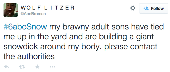 6 ABC, like any local news affiliate on a snowy day, wants to see your pictures of snow, your dog in snow, snow measurements, snowmen, snow stew, snow salad, snow and potatoes, snow burgers, snow sandwich… that… that’s about it. So, they created a hashtag: #6ABCSnow. It was harmless enough, until that dude above took control of it. From there, things got out of hand: