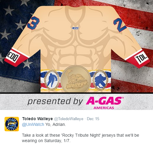 As Kyle wrote earlier this week – and I wholeheartedly agree – Rocky is played out here. Not only as in-arena hype-up material and a sports talk radio topic, but in general. That’s not the case in Ohio (I guess?), and the Toledo Walleye of the EHL are celebrating with Rocky-themed jerseys.