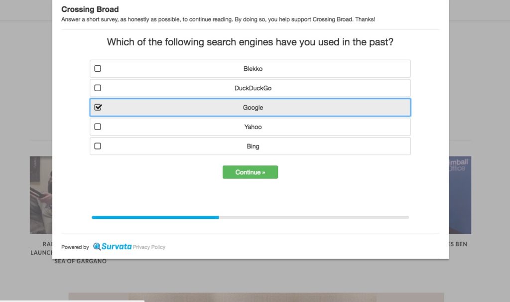 Lately, however, more publishers have joined Google’s program, which has meant that the number of available surveys has decreased. You likely haven’t gotten as many lately. So we’ve added a backup option from a company called Survata. They look a little different, but the process is identical– answer a few questions to unlock content for the day. Chances are you’ll get one of the two survey options once per day.