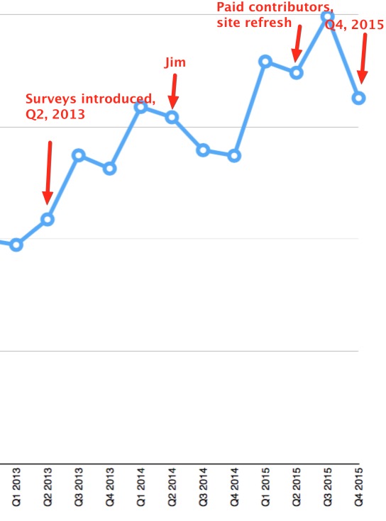 It’s been almost three years since we started using surveys on the site. At the time, I explained that one of the goals was to use the additional revenue to bring on a second full-time writer. Which I did, one year later. The use of surveys has in no way hurt site visits. In fact, the site has grown substantially since: