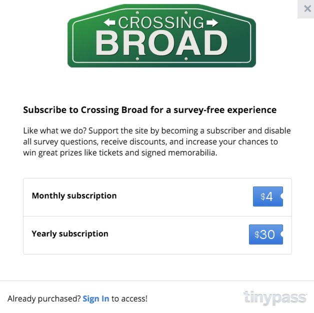 Similarly, the goal of the subscription option, from a business standpoint, is to both diversify site revenue and make it more consistent throughout the year, with the eventual goal of growing the site to include more writers and contributors and paid video and audio editors and producers. In a few years, website will be an archaic term used to refer to something that simply lives beneath a URL. To keep up the momentum, Crossing Broad needs to grow into a multi-platform outlet with video, audio, app and social content that is different, irreverent, funny, and what you’ve come to expect from CB. Those sound like buzz phrases, but that’s the way things are moving. In 5-7 years, I don’t expect Crossing Broad to be something you just type into your browser. It will be something you also watch on YouTube, read in apps, and stream through your TV and in your car. The subscriber option will allow us, through a more stable income stream, to hire the talent needed to grow. Though advertising and surveys (for non-subscribers) are not going away, having a subscriber base will lessen our reliance on those things and give us more flexibility to grow and stay ahead of the curve. I imagine the subscriber option will also extend to those aforementioned platforms in some way, shape or form.