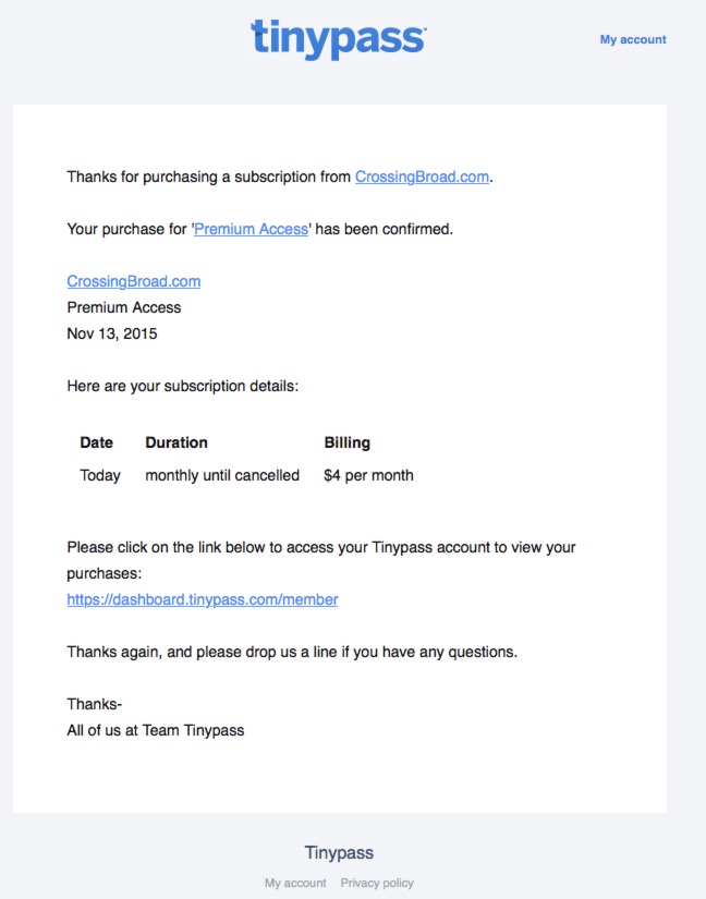 And if you realllllly like what we do and want to support the site, you can choose to pay more. Tinypass reports that in many cases up to a third of subscribers offer some amount more when given the option. You don’t have to and that is of course not even expected – I am legitimately grateful for everyone who hits that subscribe button – but it is an option.
