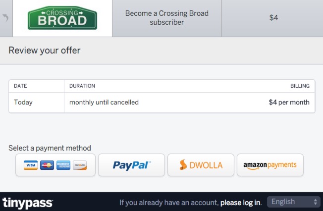 The transaction is 100% secure and managed by Tinypass – which works with many much larger websites as well as local newspapers and publications – and we never see your payment information. All we get is your name and email address, which will only be used occasionally to communicate news and updates related to your subscription, from us (no spam!).