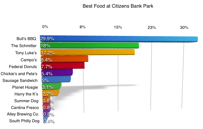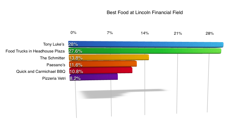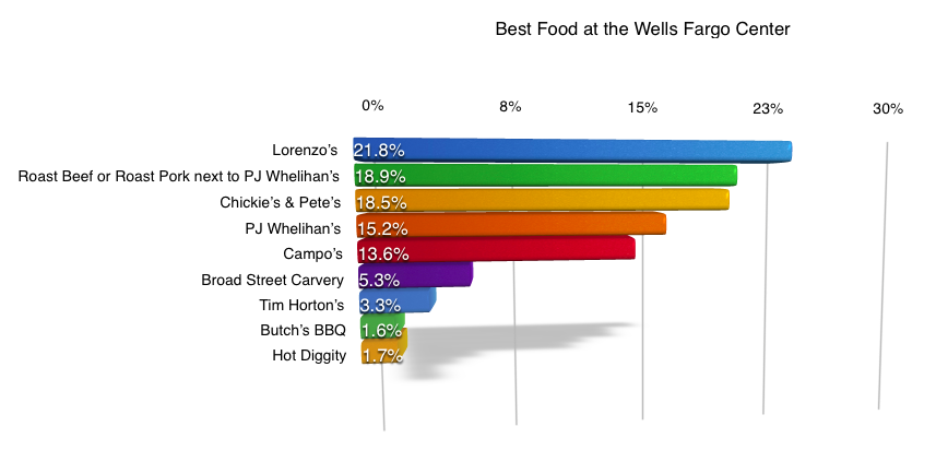 By the number of responses to the polls, it’s clear that you, like me and Kyle, eat most frequently at Citizens Bank Park (followed by the Wells Fargo Center and the Linc). In every single poll where those three arenas/stadiums were the three options, they finished in the same order. See?