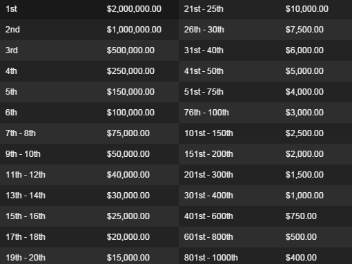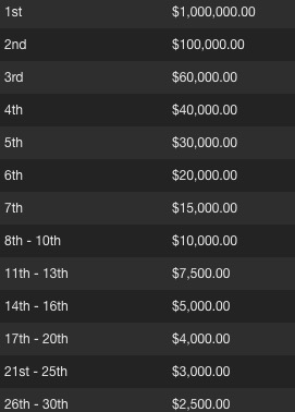 For their Week 1 challenge, Draft Kings is offering their biggest payout EVER. The top 125,700 finishers will split a prize of $10 MILLION DOLLARS. First place gets $2,000,000 and second place still gets a cool million. In fact, if you finish in the top 1,000, you’re guaranteed to bring back 20x your entry fee of $20: