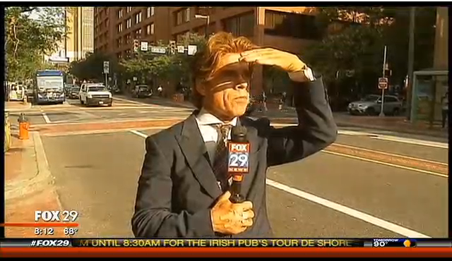 Just about a half hour ago, Good Day Philly was doing a piece on the Tour de Shore with some police officers on bikes. They were on the sidewalk outside the studio at 4th and Market. As that was happening, a TD Bank was being robbed just across the street. Steve Keeley – seen above trying to use his Terminator powers to locate the robber – noted that it was possibly the same robber who was already wanted for a previous robbery (and who many of you on Twitter pointed out looks like Kyle). The cops doing the piece, including Twitter’s own Joe Sullivan, immediately begun pursuing the suspect.