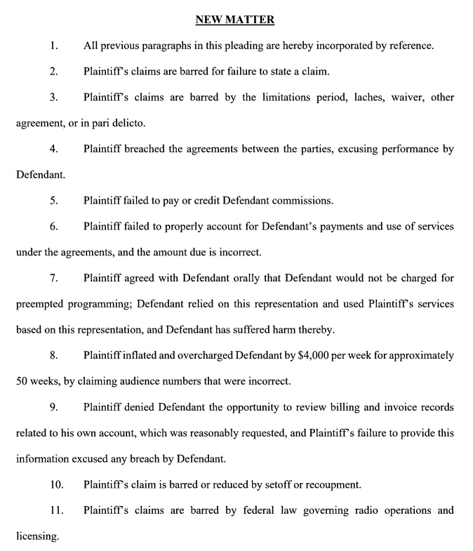 In a July, 2024 response to the filing, Krause’s lawyers denied that $90,000 of new programming was incurred, noting separately that “Plaintiff overcharged Defendant for services… Furthermore, Defendant did not request or use all invoiced services. Plaintiff further failed to credit Defendant as agreed.” It’s also alleged that not all of the agreed-to programming was aired as required, and there’s a further claim in the document stating that Krause was overcharged by $4,000 per week for 50 weeks, by stating incorrect audience numbers (bullet point #8):