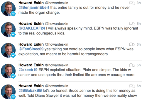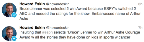 Though there’s probably a legitimate observation to be made that Caitlyn Jenner’s presence at the ESPYS was, as Bob Costas called it, “a crass exploitation play” for both ESPN-ABC (ratings) and Jenner (also ratings), this SCORCHING take from Howard Eskin, whose longtime shtick has been telling women to get back in the kitchen, took what turned out to be an overwhelmingly positive moment and, yep, pissed all over it.