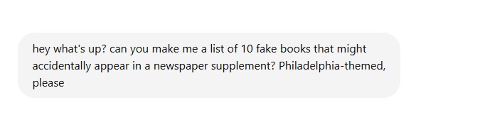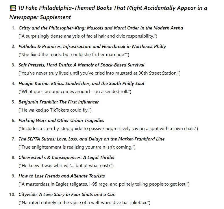 Sources tell Crossing Broad that two of the fake books were titled “Schuylkill Expressway: A Scenic and Enjoyable Driving Experience” and “Joel Embiid’s 82-Game Season.” A third story, titled “Harry Potter and the Flyers’ Recent Title” was omitted from the published list.