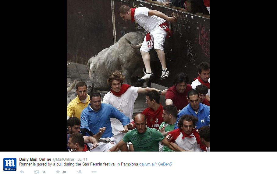 This past week was San Fermin, the famous bull-running festival in Pamplona where crazy people run from bulls and hope not to get gored near their anuses. The bull-running portion of the festival was covered very well by the Men in Blazers on the Esquire Network – probably the first notable thing they network has done – but it was a low point for one local guy who failed to avoid getting gored near his anus.