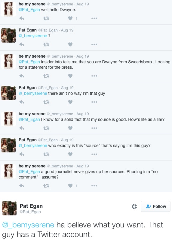 For what it’s worth, in a Twitter exchange with our tipster’s girlfriend on Friday night, Egan denied he was Dwayne, citing the fact that Dwayne had a Twitter account as evidence that he was real:
