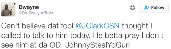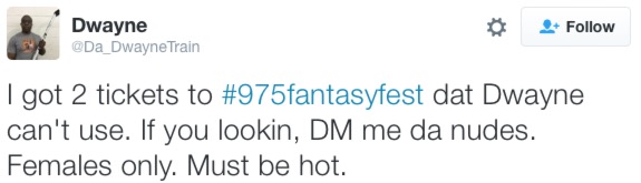 Not surprisingly, Dwayne was unable to attend 97.5’s Fantasy Fest this weekend and offered up his tickets – in exchange for nudes – on his Twitter account, where his avatar is that of a bald black man carrying a hockey stick: