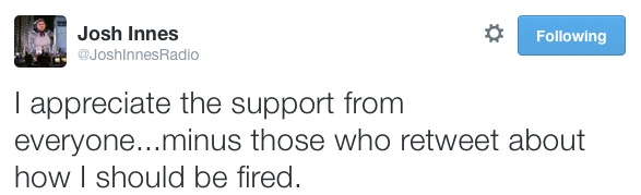 A quickly deleted (perhaps accidental) RT late last week from Bruno’s account about Josh getting fired led to these Tweets from Innes over the weekend:
