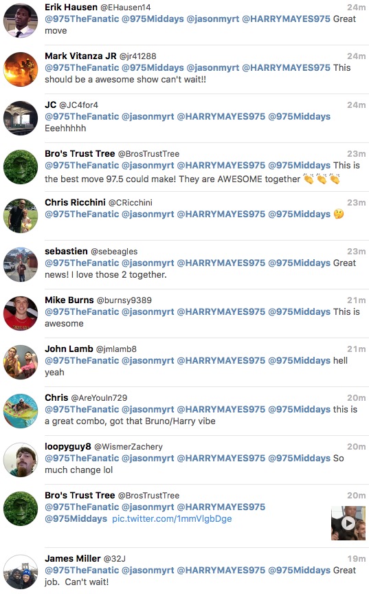 Good thing 97.5 didn’t wait until the last possible moment before the start of football season to announce their lineup changes. This morning they named Bob Cooney their new morning show co-host. And this afternoon they announced that the new Midday show will be Jason Myrtetus and Harry Mayes, who will be joined on Mondays by Seth Joyner, oh he of threatening me with LeSean McCoy fame.