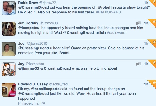 Recently demoted Rob Ellis took to the airwaves in his former 6-10 spot tonight and apparently opened with a diatribe about his current situation, saying he learned of his demotion… on Crossing Broad. I wasn’t listening, but here’s what happened, as reported by readers: