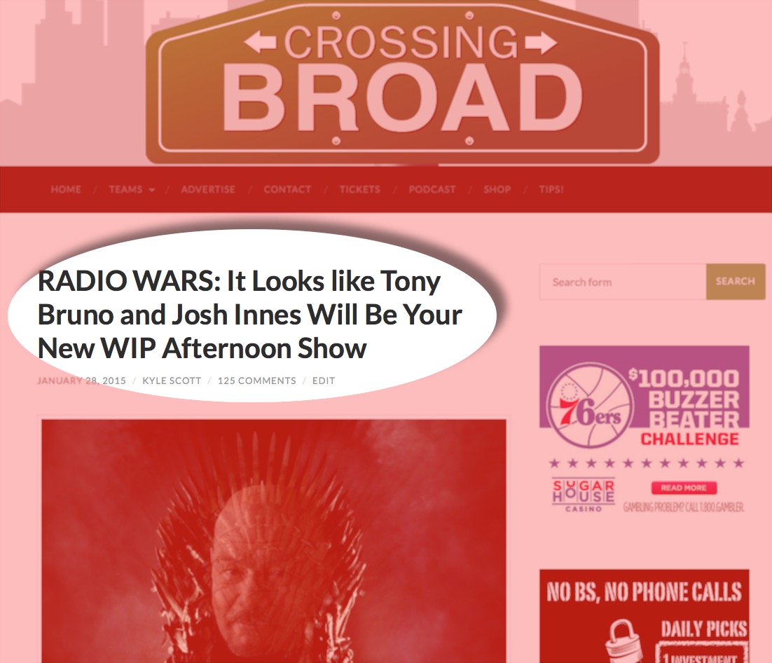 Innes and Tony Bruno will start on Wednesday, because, as noted by Molly Eichel, Bruno is flying back from Arizona tomorrow. To explain that scheduling, WIP has been running a promo (which I also keep missing), read by Bruno, about Innes being given a few days to think about what he did or said before returning to the air. The implication is that he’s suspended. That’s hogwash. It’s WIP management’s strange way of teasing the new show– apparently an amalgamation of tactics they picked up from 90s rock stations and the WWE. Maybe next they’ll have Spike Eskin interrupt Mike and Ike and challenge them to an ambulance match… you know, just to keep people tuned in: