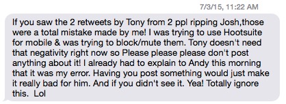 I saw the text when it came in, read it, and ignored it, both because it seemed like a non-story and because I was headed to the Shore. However, when Innes sent out the following Tweets this weekend, it became clear that the message – that the RTs from Bruno’s account about Innes getting fired were an accident – wasn’t received by Innes, or, depending on your view, was ignored by Innes: