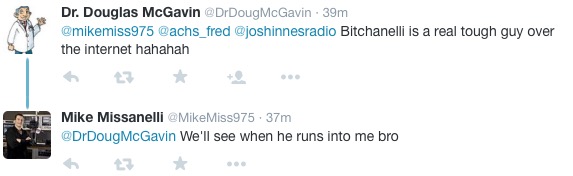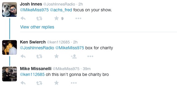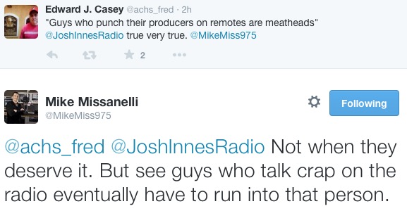 This may be an absolutely unprecedented event in local media, anywhere. The chirp-fest, potshots, and insults have gone on for months now – with most coming from one side – but over the last week, we’ve seen online, public responses from the longtime afternoon ratings champ, Mike Missanelli, who’s all but threatened to knock Josh Innes out if and when he sees him. It was alluded to last week. Yesterday, it was a bit less subtle… and all brought about with this Tweet, from a priest!