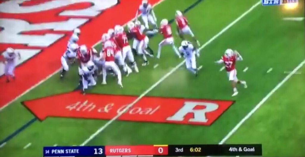 But I am here to show you this “highlight” which took place with Rutgers trailing 13-0 in the third quarter facing a fourth and goal from the Penn State two-yard line: