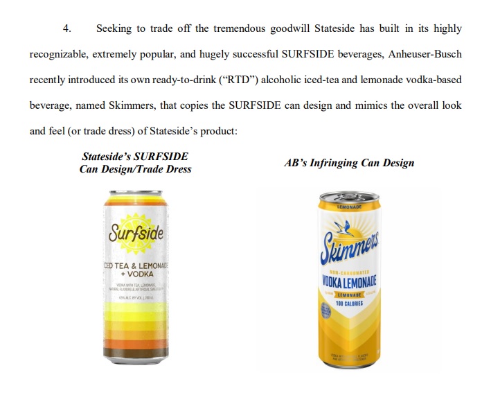 On Tuesday, Stateside Brands, LLC filed a lawsuit in Philadelphia’s federal court alleging that Anheuser-Busch’s Skimmers product infringes on Stateside’s trademarks related to Surfside. Stateside doesn’t dispute that Anheuser-Busch has the right to market its own brand of vodka-iced tea canned cocktails, a category that Stateside pioneered with Surfside. It is the design elements of Skimmers that Stateside maintains violate the law.