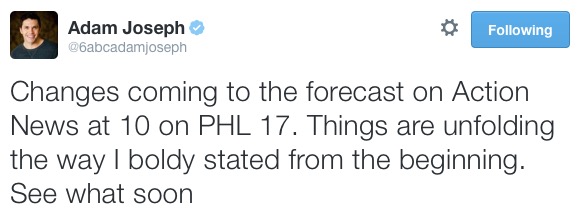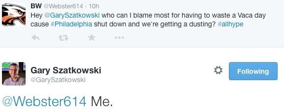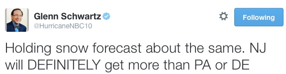 I’d call out J-Bo’s updates from yesterday, but he has a 1998 thing going on with his site, WeatherSavior.com, where he just keeps updating the same page. You’d think that would be all too convenient for a meteorologist who wants to Chad Ford his forecasts, but despite his use of ALL CAPS and GIANT, ALLITERATIVE-VOWLED LOCUTIONS TO SCARE THE SHIT OUT OF US, he consistently forecasted the low end of the range– basically from 4 to 10 inches in most parts of the area. When he switched to a solid 4 last night, it was all but the death knell for the storm in Philly.
