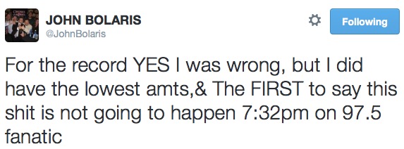 Adam Joseph, though still wrong, stuck to his guns on the lower end. Here’s what he wrote on Facebook yesterday morning: