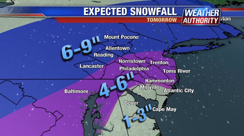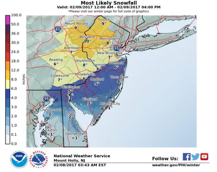 Most forecasts are in agreement that most of the Philly area will get a minimum of 4-6 inches, and then more further north and west, perhaps as much as 10 inches in Upper Bucks (hello!) and whatever counties are above it on the way to Allentown. Snow will be HEAVY at times. I’m talking hold your loved ones close and your gonads closer heavy. Up to two inches per hour during the height of the storm, the morning rush.