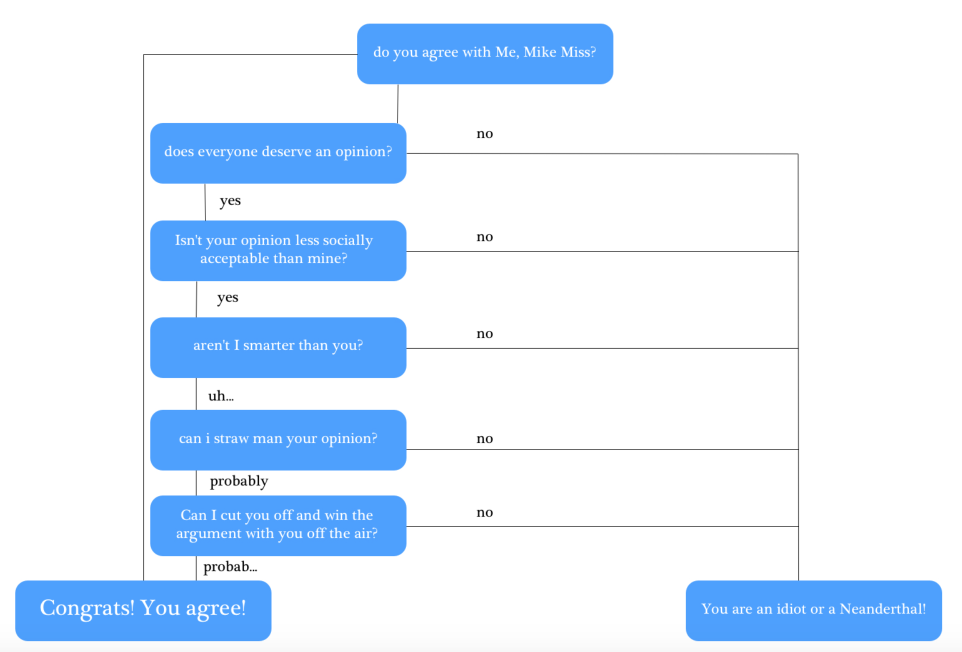 For the most part, Mike does a good job at hiding this. He is a consummate radio professional. He can build a whole show around “The Eagles released Dawkins too early because he had a subjective value.” This sets up for 4 hours of him demolishing listeners arguments because you cant quantify “subjective value.” He can therefore move the goal posts infinitely so that he comes out on top. It is like when your older brother would change the rules of games so that you couldn’t win. This is maddening to listen to because every argument tends to follow the flow chart above.