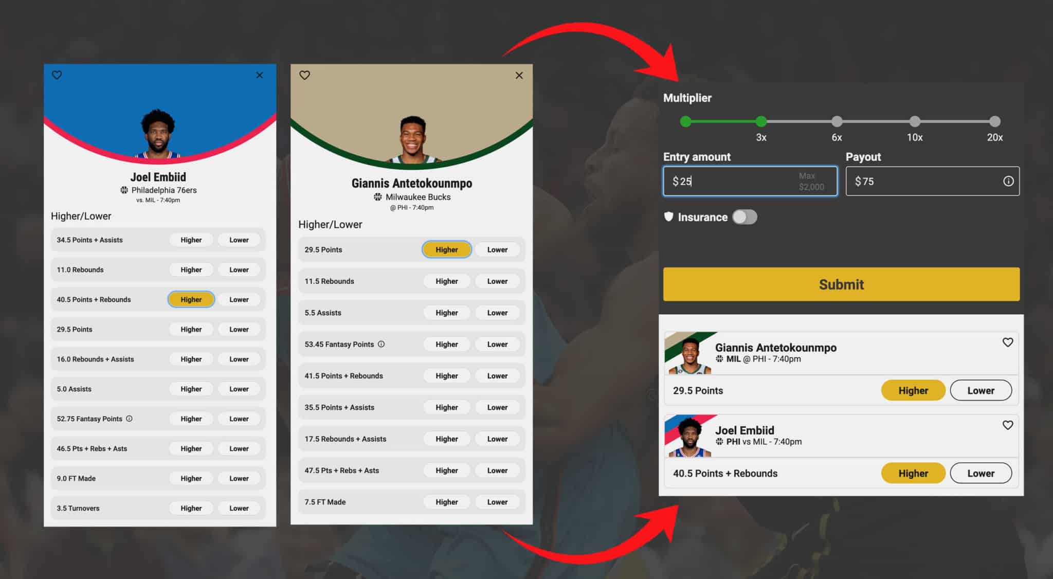 What you might be less familiar with are the Underdog pick’em contests. In these contests you can pick higher/lower stats for particular players and win money. Let’s make a pick for both Embiid and Giannis in tonight’s game below. By combining two picks, I lock in a 3x multiplier. This means my $25 entry can win $75. If you added a third pick, it goes to 6x multiplier, or $150 on $25 entry. This will remind you of course of player prop bets, but in Underdog, you can do these pick’em contests in almost any state (many more states than legal sports betting). Check it out: