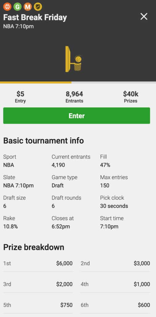 Tonight’s “Fast Break Friday” contest means you can post a $5 entry fee, draft your team of six players from tonight’s games and take a stab at accumulating enough points to finish in the money for $40k worth of prizes. First place wins $6,000. You can see a screenshot here: