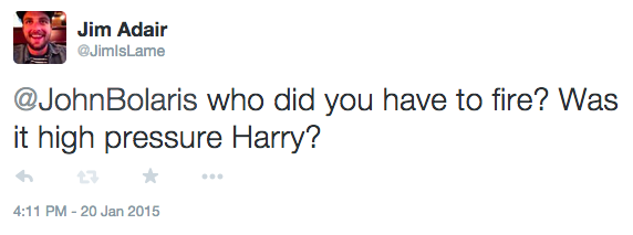 John Bolaris did not take it in stride when — from his point of view — poor weather forecasting led directly to the death of three people. He initially took the blame himself, but has since come around to “it was someone else’s fault.” He saw it as an unforgivable lapse in weather judgement, and fired “an employee” at Weather Savior over it. Kyle figured he probably knew who it was, and mandated that I Tweet Bolaris to find the truth (Journalism, yo):
