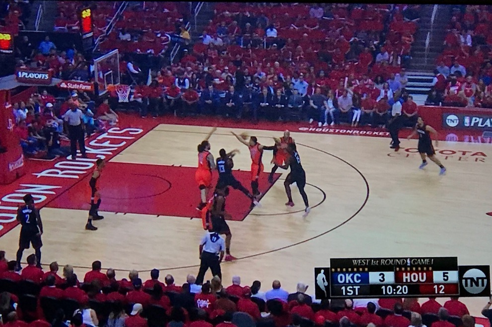 Fair warning: I am irrationally angry over this screenshot. Let’s set the scene: The Rockets are playing at home, on their red court, in front of red-out fans, wearing black. The Thunder, who wear blue, have a blue score bug, are on the road, wearing orange. WAYYYYYYY too much going on here. Throw in the smoke from the pre-game pyrotechnics, and you have a full-blown assault on the sports-time continuum. Who’s home? What year is it? Is this red and black hellscape what Kane masturbates to?