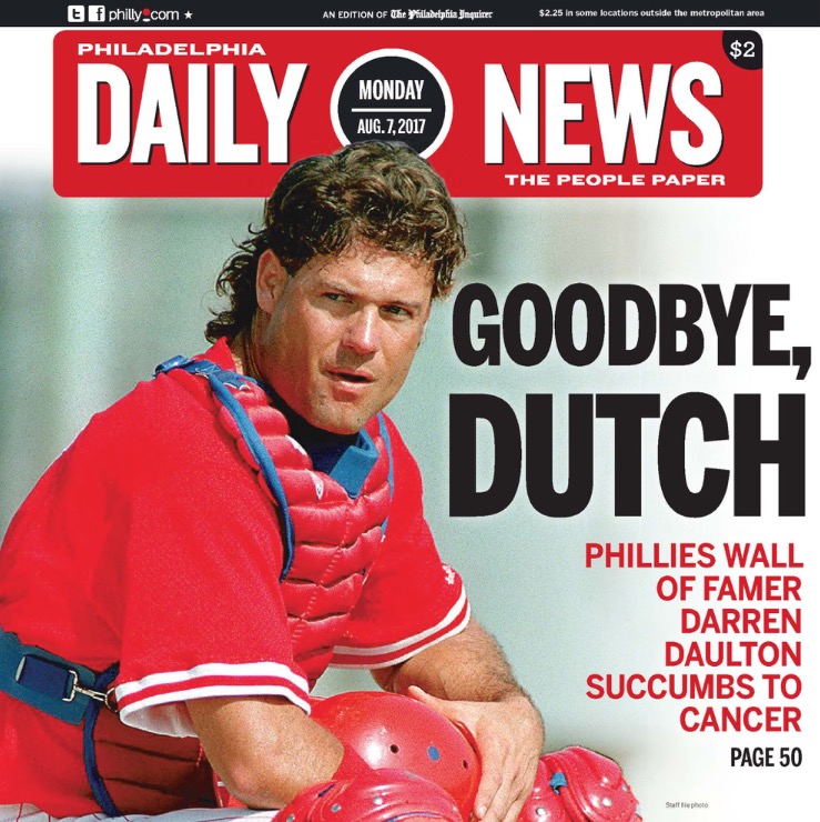 Tough day. I’m willing to bet that for many if not most of our readers Darren Daulton was the first Philly athlete they loved. Everyone has a positive Dutch story. This was arguably his biggest hit as a Phillie: