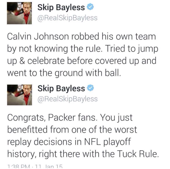 Cowboys fan and noted blowhard Skip Bayless has a bit of a Twitter meltdown yesterday (with good reason), and of course his position differed from the one he had in 2011 when a similar thing happened to Calvin Johnson: