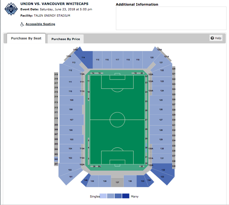 If you’re looking for tickets near the center of the pitch, Section 107 has three seats at midfield for $101 each. If you’ve never been to a Union game before, now is the perfect time to go. Fans and casual attendees often speak glowingly about the amazing view from every seat in Talen Energy Stadium.