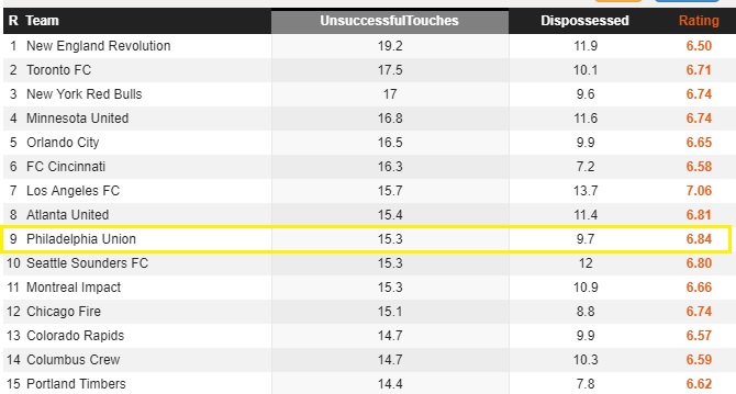 Fortunately, the Union are only being dispossessed 9.7 times per game, which is 17th out of 24 teams. It’s not happening as frequently as it could be. But they are averaging 15.3 unsuccessful touches per game, which is 9th in the league: