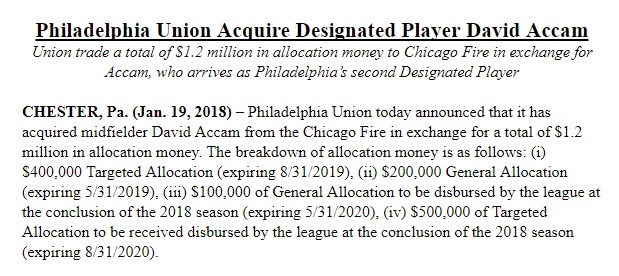 Accam is a speedy attacker who put up a career-high 14 goals and 8 assists last year. He’s played three MLS seasons and was heading into the final year of his Chicago contract. I’d assume, hopefully, that the Union wouldn’t spend $1.2 mill on a guy who might not re-sign. Accam had recently been going back and forth with the Fire front office over his contract situation, which might have precipitated their decision to move him. He’s a designated player who made a $750,000 base salary last season.